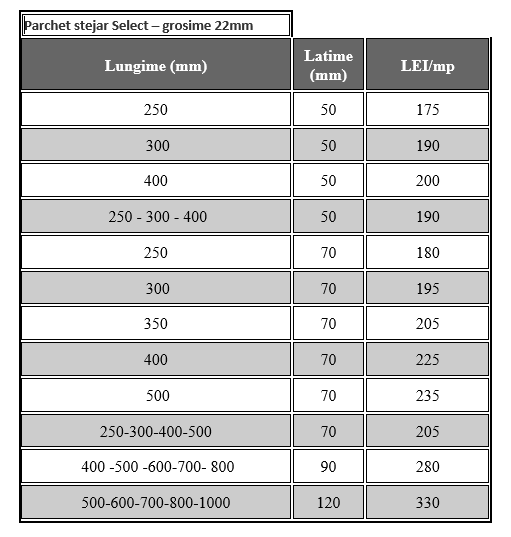 Clasa Select înseamnă că pe fața principală, văzută a parchetului se acceptă doar noduri mici, sănătoase, de maximum 10 mm, ceea ce conferă un aspect uniform, mininimalist podelei.